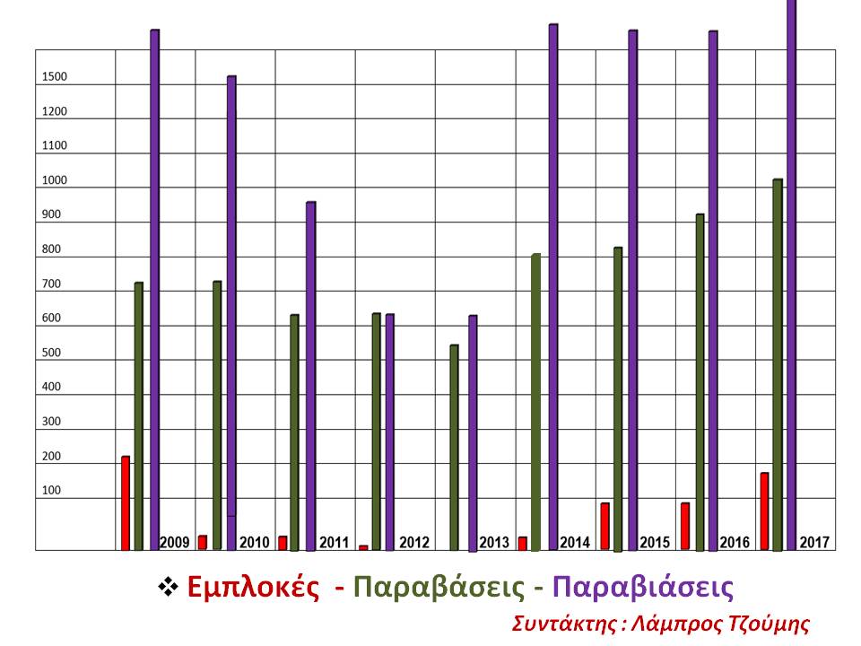 – Σε μια χρονική περίοδο εννέα ετών δηλ. από το 2009 έως και το τέλος του 2017 είχαμε 13.872 παραβιάσεις και 6.928 παραβάσεις. Δηλαδή συνολικά 20.800 παραβιάσεις – παραβάσεις, που σημαίνει 2.311 κατά μέσο όρο περίπου κατ΄ έτος.