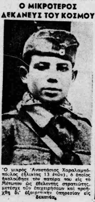 Να σημειωθεί οτι και άλλες εφημερίδες της εποχής φαίνεται να έδωσαν χώρο από το πρωτοσέλιδο τους στον μικρό Αναστάσιο Χαραλαμπόπουλο, όπως ήταν και η εφημερίδα «Ακρόπολις», η οποία αναφέρθηκε στον 13χρoνο πολεμιστή με το τίτλο «Ο Μικρότερος δεκανεύς του Κόσμου»(παρακάτω).