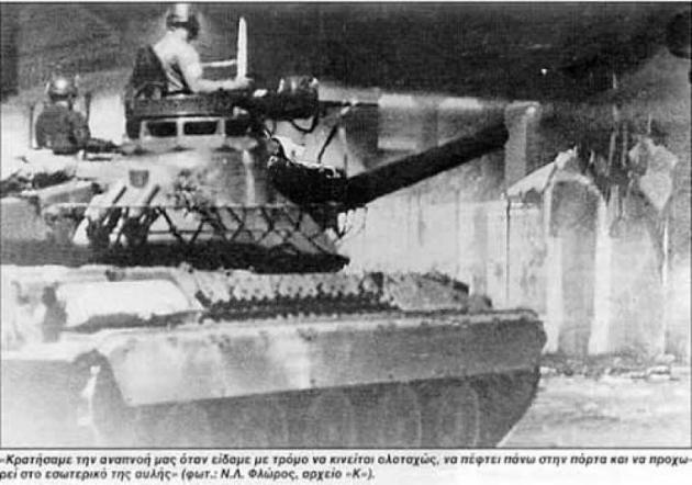 - 2 το πρωί. «Φτάνοντας μπροστά στην πόρτα, έστριψα το άρμα προς το Πολυτεχνείο, με γυρισμένο το πυροβόλο προς τα πίσω. Θυμάμαι ότι σηκώθηκα από τη θέση μου και εγώ και το άλλο πλήρωμα. Δεκάδες φοιτητές κρέμονταν από τα κάγκελα, ενώ εκατοντάδες βρίσκονταν στον προαύλιο χώρο. Εδειχναν πανικόβλητοι Και εγώ, να σκεφτείς ότι τους έβλεπα σαν μαμούνια που ήθελα να τα φάω»!