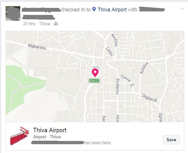 Χθες μάλιστα, την ώρα που πέρασε από την αερολέσχη της Θήβας έκανε ckeck-in το οποίο δημοσιοποίησε στους φίλους του μέσω της δημοφιλούς πλατφόρμας Facebook.