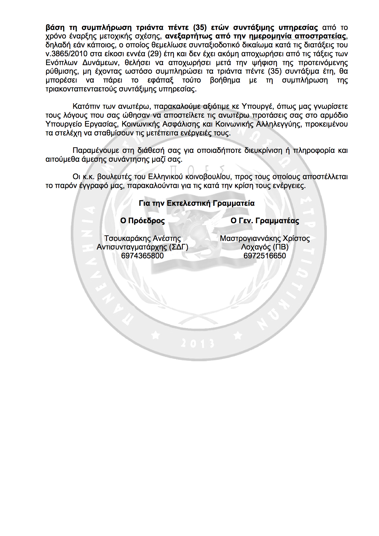 Κάτι τρέχει με το εφάπαξ των στρατιωτικών. Σύμφωνα με πληροφορίες που δημοσιοποιήθηκαν από την Ένωση Στρατιωτικών Περιφέρειας Θεσσαλίας σε έγγραφο που φέρει την υπογραφή του ΥΕΘΑ Πάνου Καμμένου προτείνεται η καταβολή του εφάπαξ βοηθήματος με βάση τη συμπλήρωση τριάντα πέντε (35) ετών συντάξιμης υπηρεσίας από το χρόνο έναρξης της μετοχικής σχέσης, ανεξαρτήτως από την ημερομηνία αποστρατείας, με σκοπό να αντιμετωπιστεί τυχόν αυξημένος αριθμός αιτήσεων εφάπαξ που θα υποβληθούν στο μεσοπρόθεσμο διάστημα.