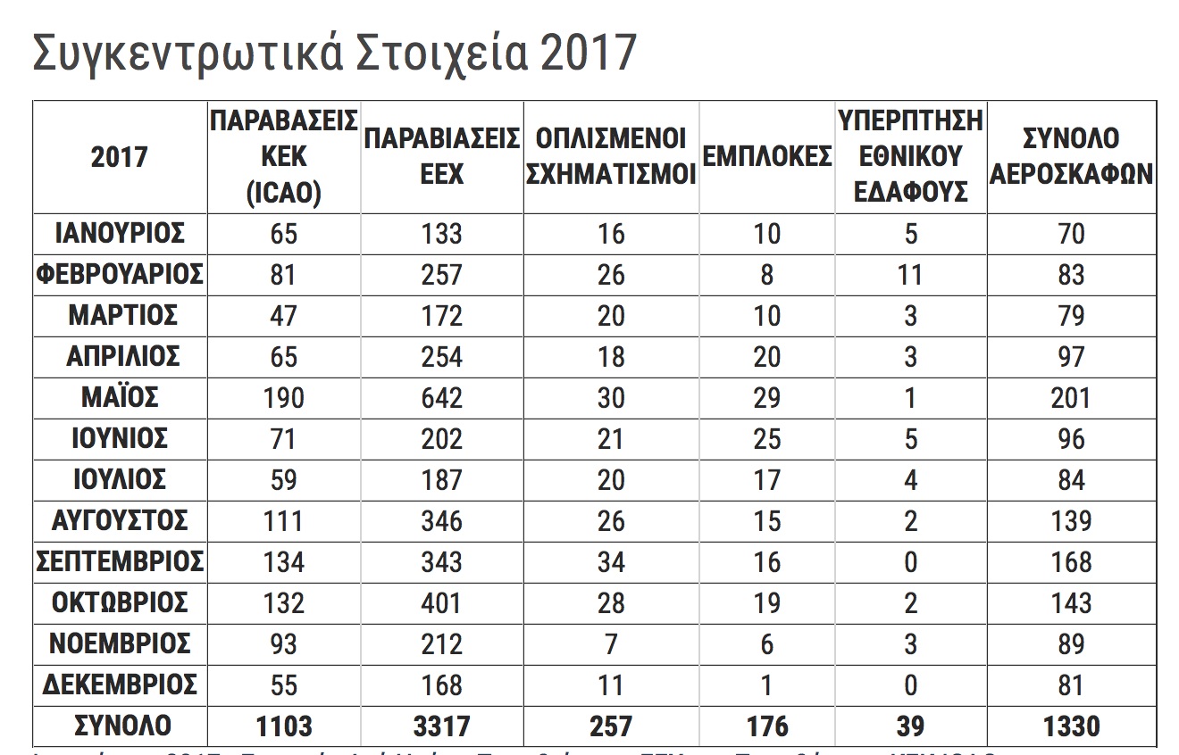 Τρομακτικά είναι τα στοιχεία και για τις εναέριες παραβιάσεις. 97,68% είναι το ποσοστό της αύξησης τους. Οι 1678 παραβιάσεις του 2009,σχεδόν υπερδιπλασιάστηκαν το 2017 όταν ανήλθαν στις 3317. Ενδεικτική της επιθετικότητας είναι ότι κατά την ίδια περίοδο, οι υπερπτήσεις πάνω από ελληνικό έδαφος αυξήθηκαν κατά 721%.