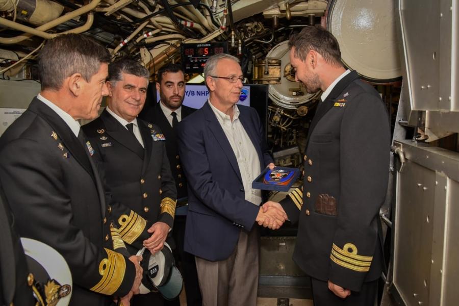 Τον ΑΝΥΕΘΑ συνόδευαν ο Αρχηγός ΓΕΝ Αντιναύαρχος Νικόλαος Τσούνης ΠΝ, η Ειδική Γραμματέας του Υπουργείου Καλλιόπη Παπαλεωνίδα, ο Αρχηγός του Στόλου Αντιναύαρχος Ιωάννης Παυλόπουλος ΠΝ και ο Διοικητής Διοικητικής Μέριμνας Ναυτικού Αντιναύαρχος (Μ) Νικόλαος Καφέτσης ΠΝ .