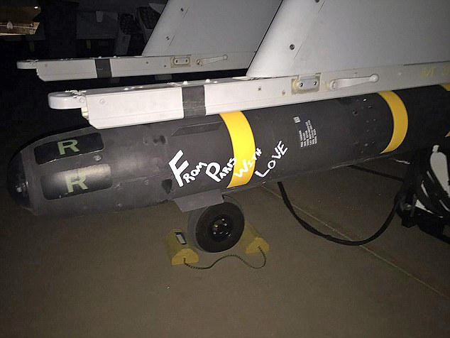 Το μήνυμα εμφανίζεται σε πυραύλους τύπου Hellfire και βόμβες JDAM σε μια πράξη αλληλεγγύης στους Γάλλους και στα θύματα των επιθέσεων του Παρισιού.