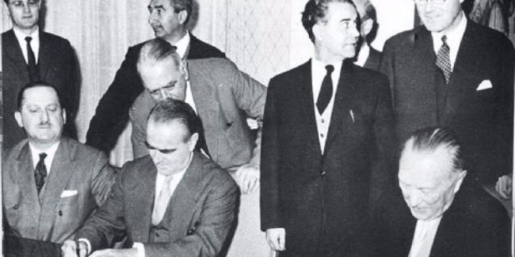 Η φωτογραφία είναι από εκείνη την συμφωνία του Λονδίνου το 1953, με τον Κωνσταντίνο Καραμανλή να υπογράφει την «διευκόλυνση» των Γερμανών.