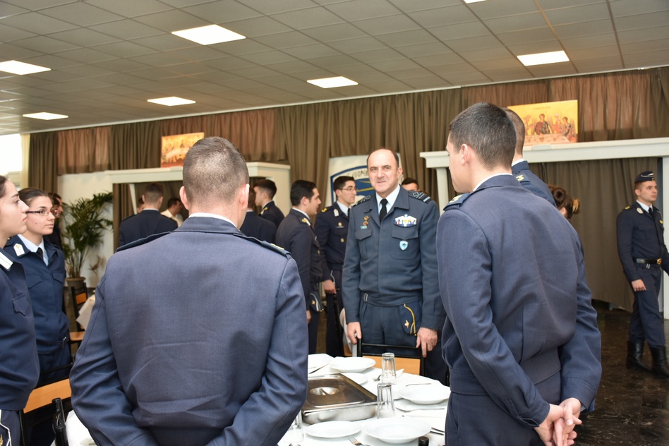 Ο αρχηγός ΓΕΑ, μάλιστα γευμάτισε με τα αυρινά «γεράκια» της Πολεμικής Αεροπορίας. Κάθισε στο ίδιο τράπεζι με δευτεροετείς και τεταρτοετείς σπουδάστες και σύμφωνα με τις πληροφορίες το μενού περιλάμβανε φασολάδα, πατατοσαλάτα και ψάρι.