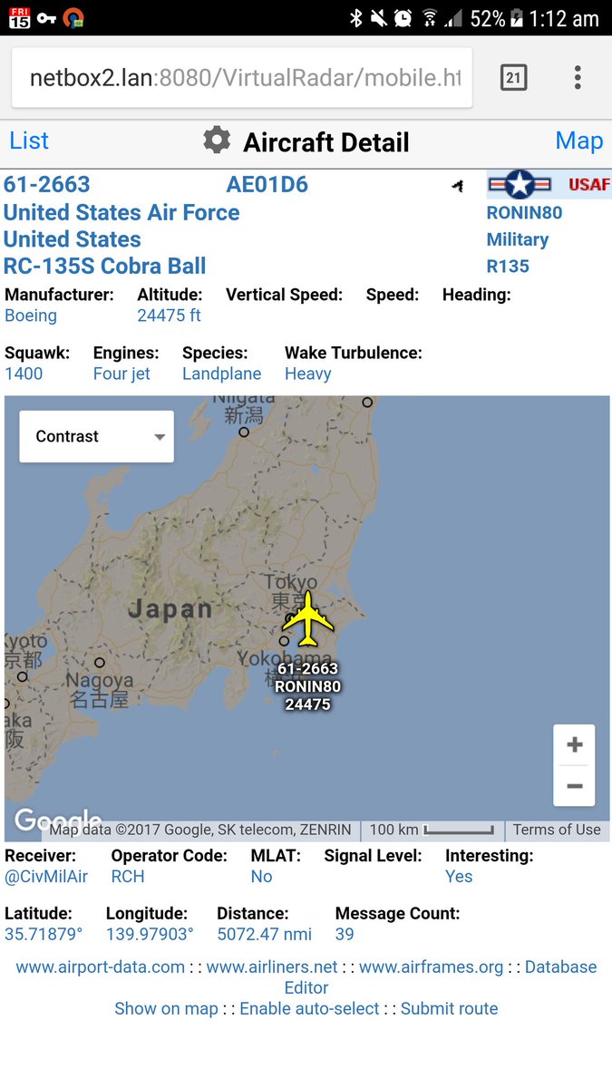 Δείτε το ειδικά εξοπλισμένο κατασκοπευτικό «Cobra Ball» σε μια από τις επισκέψεις του στην βάση Kadena, στην Οκινάουα, στο ακόλουθο βίντεο.