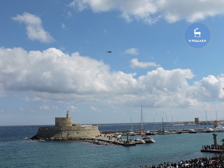 Αεροπλάνο f-16 της ομάδας Ζευς, μετά τη λήξη της παρέλασης, πραγματοποίησε για αρκετή ώρα επίδειξη δεξιοτεχνίας και ακροβατισμούς πάνω από την πόλη της Ρόδου όπου ήταν συγκεντρωμένοι χιλιάδες Ροδίτες που συμμετείχαν στις εκδηλώσεις εορτασμού.