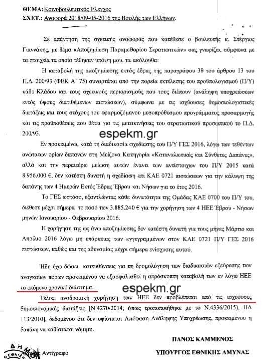 Απαντώντας σε κοινοβουλευτικό έλεγχο σε ερώτηση του βουλευτή Στέργιου Γιαννάκη, ο κ. Καμμένος υποστήριξε ότι το ΓΕΣ έχοντας εξαντλήσει κάθε δυνατότητα από συγκεκριμένους κωδικούς του προϋπολογισμού, κατάφερε και διέθεσε ποσό για την χορήγηση των 4 ΗΕΕ Έβρου-νήσων για τους μήνες Ιανουαάριο και Φεβρουάριο.