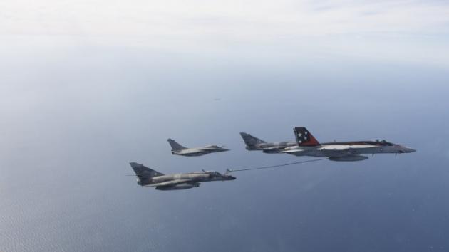 Στις φωτογραφίες απεικονίζεται ενα F / A-18E Superhornet – πρωταγωνιστής του τελευταίου χρονικού διαστήματος λόγω του ρόλου του στον πόλεμου κατά του Ισλαμικού Κράτους – να ανεφοδιάζει δυο γαλλικά Super Etendard κι ενα Rafale απο το αεροπλανοφόρο Charles De Gaulle, στην περιοχή του αμερικανικου αεροπλανοφόρου USS Carl Vinson (CVN 70), το οποίο μπορείτε να διακρίνεται στο βάθος της εντυπωσιακής φωτογραφίας.