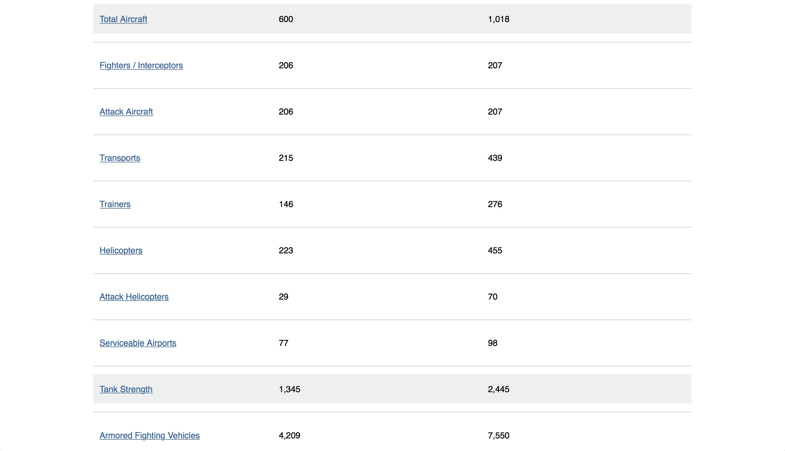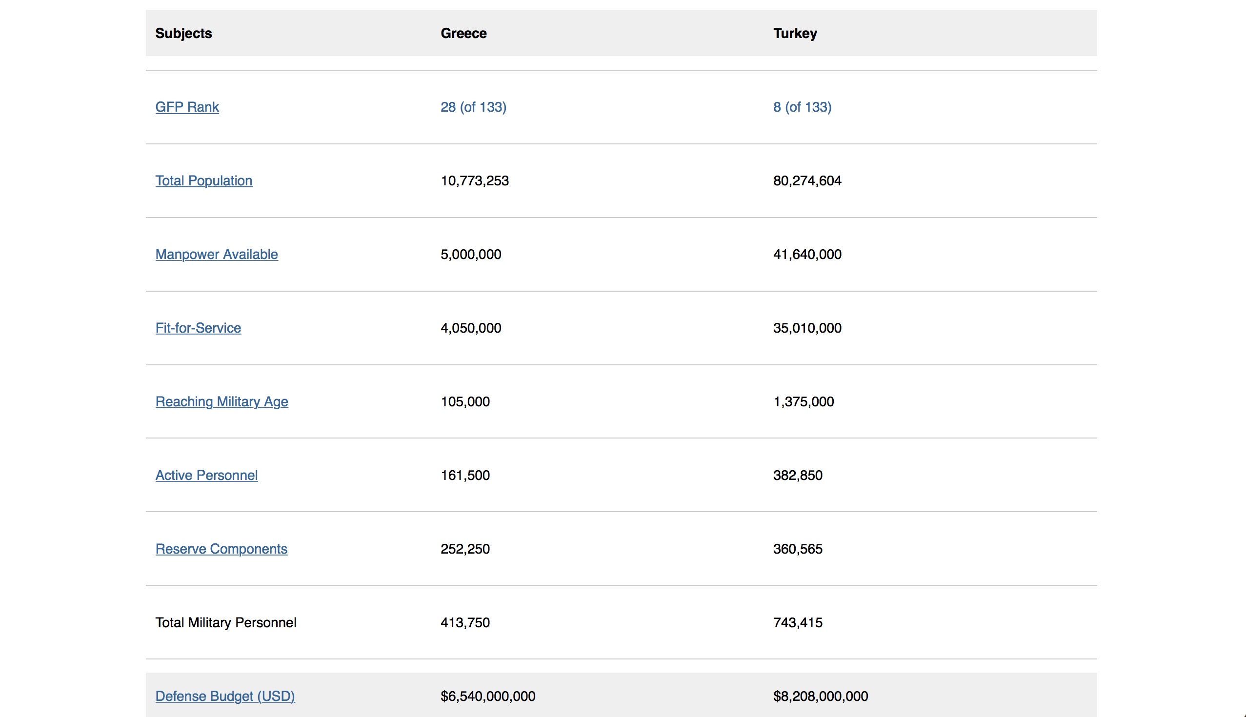 Σύμφωνα τώρα με τις μετρήσεις της ιστοσελίδας globalfirepower.com από τη σύγκριση της στρατιωτικής ισχύος των δύο χωρών, προκύπτει ξεκάθαρα αυτή η αριθμητική υπεροπλία. Με “άριστα” το 0 η Τουρκία έχει δείκτη ισχύος 0,2623, ενώ η Ελλάδα 0,5147. Με λόγο 1/1,96 η Τουρκία σύμφωνα με την ιστοσελίδα διαθέτει σχεδόν διπλάσια, στρατιωτική ισχύ απο την Ελλάδα. Η υπεροπλία δεν προκύπτει μόνο από την καθαρή αριθμητική υπεροχή, αλλά κυρίως από τον τύπο των οπλικών συστημάτων. Η Ελλάδα έως και το 2017 καταλάμβανε την 28η θέση σε σύνολο 126 χωρών, ανάμεσα στην Ισπανία και τη Σουηδία, με την Τουρκία να βρίσκεται στην 8η θέση, πάνω από τη Γερμανία.
