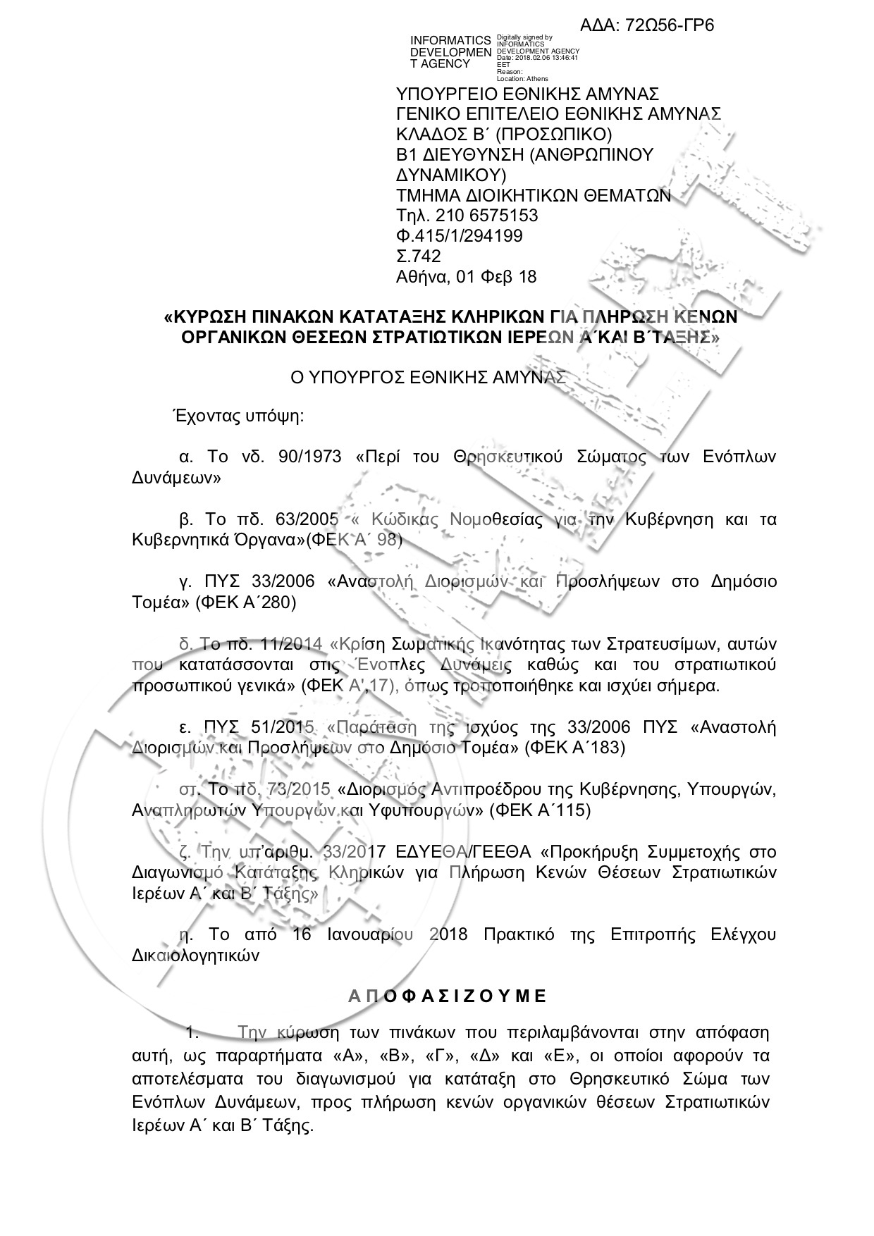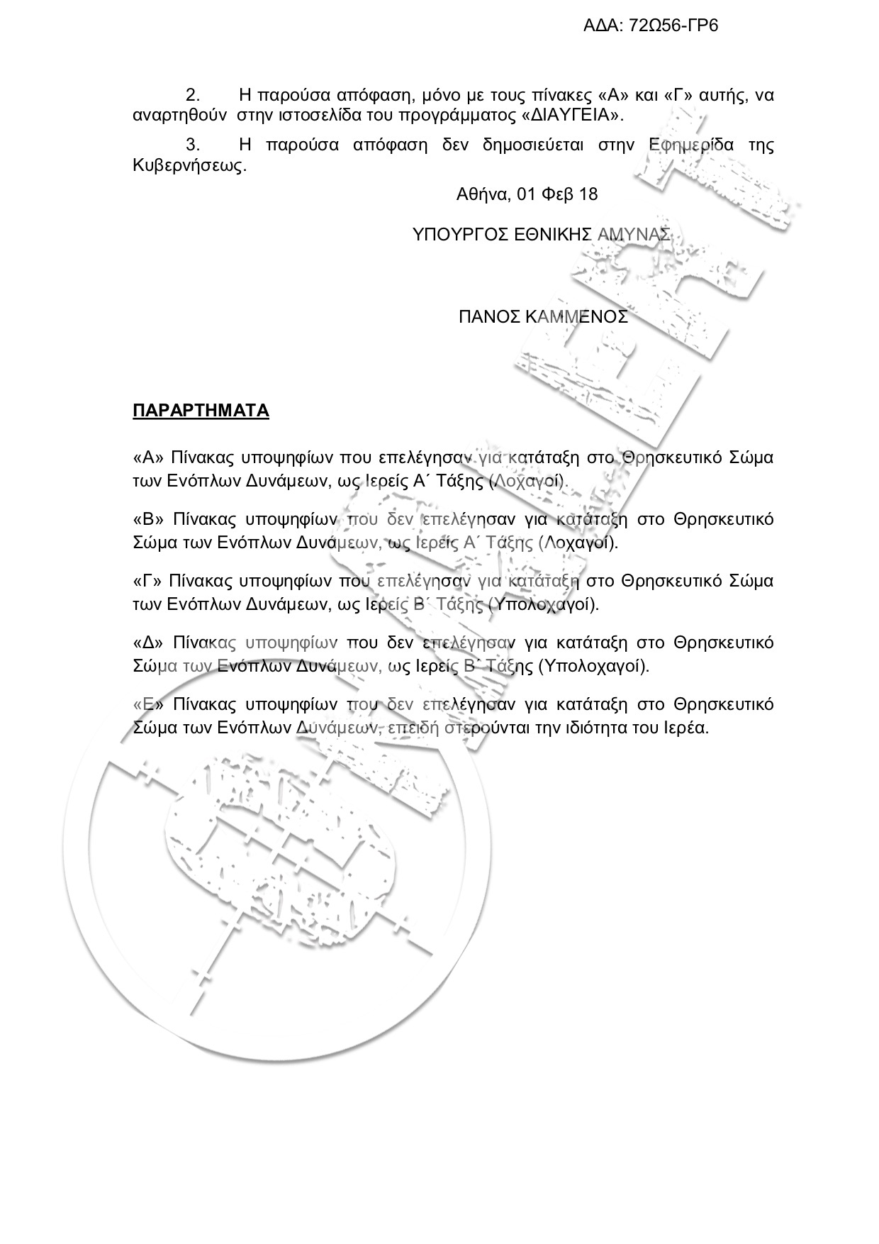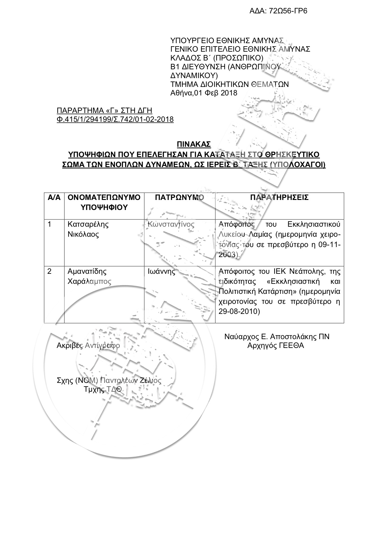 Οι πίνακες υποψηφίων που επελέγησαν για κατάταξη στο Θρησκευτικό Σώμα των Ενόπλων Δυνάμεων, ως ιερείς Β ́ Τάξης, δηλαδή Υπολοχαγοί.