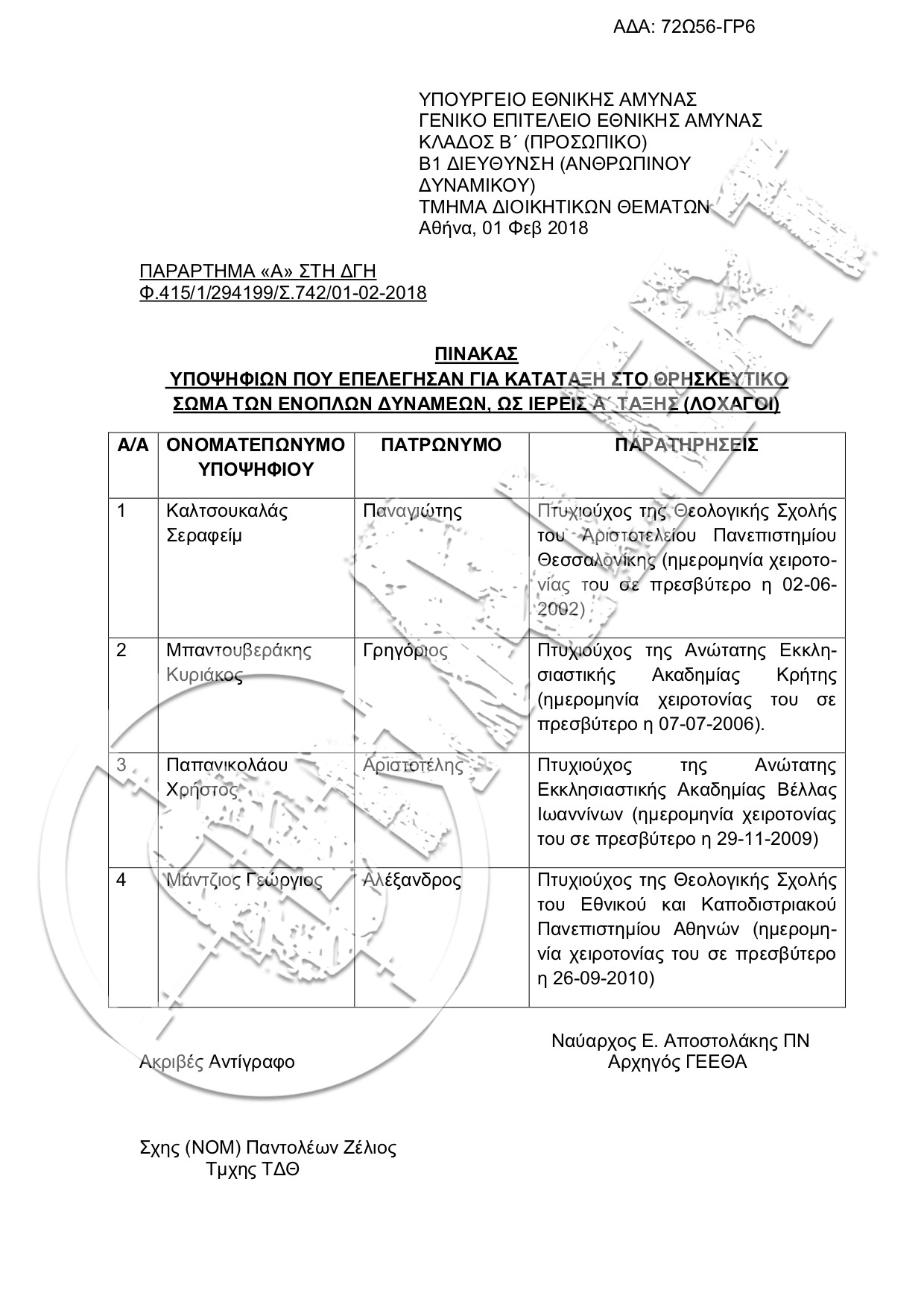 Οι πίνακες υποψηφίων που επελέγησαν για κατάταξη στο Θρησκευτικό Σώμα των Ενόπλων Δυνάμεων, ως ιερείς Α ́ Τάξης, δηλαδή λοχαγοί.