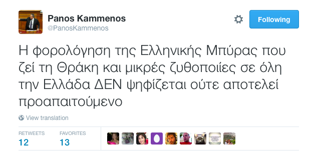 Ο κ. Καμμένος με μήνυμά του στο twitter σημειώνει πως η ελληνική μπύρα ζει τη Θράκη και δεν πρόκειται να ψηφίσουν το σχετικό άρθρο, σημειώνοντας επίσης πως κάτι τέτοιο δεν ήταν καν στα προαπαιτούμενα, δείχνοντας πως ήταν απόφαση της κυβέρνησης το συγκεκριμένο μέτρο και όχι απαίτηση των δανειστών.