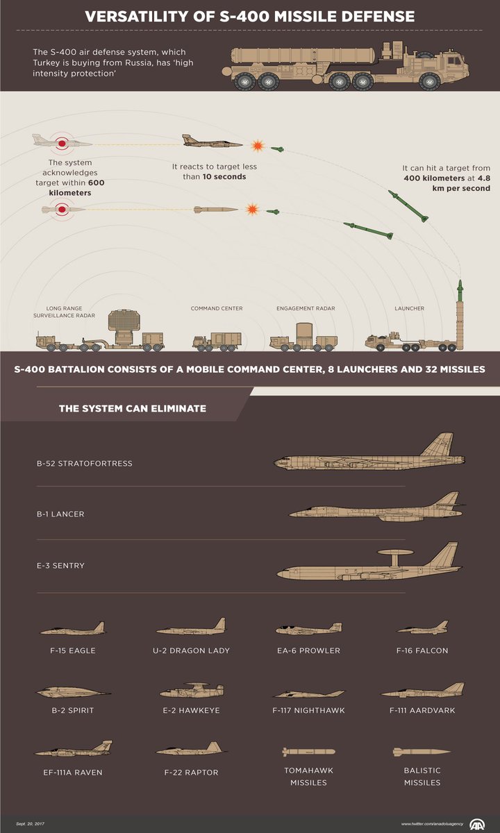 Αίσθηση έχει προκαλέσει η ανάρτηση του τουρκικού ειδησεογραφικού πρακτορείου Anadolu ενός γραφήματος που δείχνει ποια αμερικανικά και ΝΑΤΟϊκά αεροσκάφη μπορεί να καταρρίψουν οι αντιαεροπορικοί S-400. Σύμφωνα με τον πίνακα τον οποίο… όλως τυχαίως επέλεξε τώρα να αναρτήσει το -κρατικό- πρακτορείο “Ανατολή” στην σελίδα του στο Twitter, οι ρωσικοί πύραυλοι που η Άγκυρα επαναλαμβάνει με κάθε ευκαιρία ότι προσθέτει στο οπλοστάσιό της μπορούν να καταρρίψουν σχεδόν ότι πετά σήμερα: βομβαρδιστικά B-52 και Β-1Β Lancer, B-2 stealth, μαχητικά F-15, F-16 και F-22, ιπτάμενα ραντάρ E-3 AWACS, πυραύλους κρουζ Tomahawk…