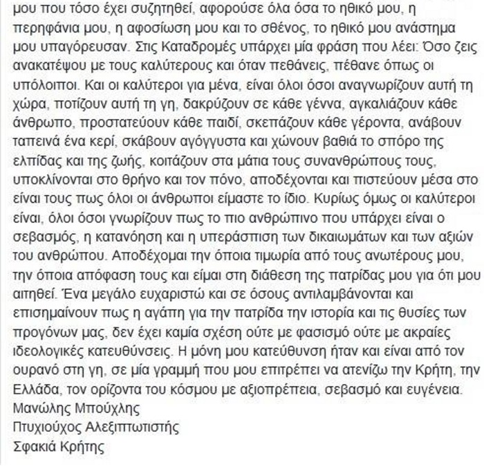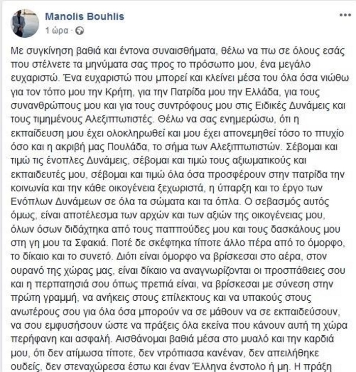 Με συγκίνηση βαθιά και έντονα συναισθήματα, θέλω να πω σε όλους εσάς που στέλνετε τα μηνύματα σας προς το πρόσωπο μου, ένα μεγάλο ευχαριστώ. Ένα ευχαριστώ που μπορεί και κλείνει μέσα του όλα όσα νιώθω για τον τόπο μου την Κρήτη, για την Πατρίδα μου την Ελλάδα, για τους συνανθρώπους μου και για τους συντρόφους μου στις Ειδικές Δυνάμεις και τους τιμημένους Αλεξιπτωτιστές. Θέλω να σας ενημερώσω, ότι η εκπαίδευση μου έχει ολοκληρωθεί και μου έχει απονεμηθεί τόσο το πτυχίο όσο και η ακριβή μας Πουλάδα, το σήμα των Αλεξιπτωτιστών. Σέβομαι και τιμώ τις ένοπλες Δυνάμεις, σέβομαι και τιμώ τους αξιωματικούς και εκπαιδευτές μου, σέβομαι και τιμώ όλα όσα προσφέρουν στην πατρίδα την κοινωνία και την κάθε οικογένεια ξεχωριστά, η ύπαρξη και το έργο των Ενόπλων Δυνάμεων σε όλα τα σώματα και τα όπλα. Ο σεβασμός αυτός όμως, είναι αποτέλεσμα των αρχών και των αξιών της οικογένειας μου, όλων όσων διδάχτηκα από τους παππούδες μου και τους δασκάλους μου στη γη μου τα Σφακιά. Ποτέ δε σκέφτηκα τίποτε άλλο πέρα από το όμορφο, το δίκαιο και το συνετό. Διότι είναι όμορφο να βρίσκεσαι στο αέρα, στον ουρανό της χώρας μας, είναι δίκαιο να αναγνωρίζονται οι προσπάθειες σου και η περπατησιά σου όπως πρεπιά είναι, να βρίσκεσαι με σύνεση στην πρώτη γραμμή, να ανήκεις στους επίλεκτους και να υπακούς στους ανωτέρους σου για όλα όσα μπορούν να σε μάθουν να σε εκπαιδεύσουν, να σου εμφυσήσουν ώστε να πράξεις όλα εκείνα που κάνουν αυτή τη χώρα περήφανη και ασφαλή. Αισθάνομαι βαθιά μέσα στο μυαλό και την καρδιά μου, ότι δεν ατίμωσα τίποτε, δεν ντρόπιασα κανέναν, δεν απειλήθηκε ουδείς, δεν στεναχώρεσα έστω και έναν Έλληνα ένστολο ή μη. Η πράξη μου που τόσο έχει συζητηθεί, αφορούσε όλα όσα το ηθικό μου, η περηφάνια μου, η αφοσίωση μου και το σθένος, το ηθικό μου ανάστημα μου υπαγόρευσαν. Στις Καταδρομές υπάρχει μία φράση που λέει: Όσο ζεις ανακατέψου με τους καλύτερους και όταν πεθάνεις, πέθανε όπως οι υπόλοιποι. Και οι καλύτεροι για μένα, είναι όλοι όσοι αναγνωρίζουν αυτή τη χώρα, ποτίζουν αυτή τη γη, δακρύζουν σε κάθε γέννα, αγκαλιάζουν κάθε άνθρωπο, προστατεύουν κάθε παιδί, σκεπάζουν κάθε γέροντα, ανάβουν ταπεινά ένα κερί, σκάβουν αγόγγυστα και χώνουν βαθιά το σπόρο της ελπίδας και της ζωής, κοιτάζουν στα μάτια τους συνανθρώπους τους, υποκλίνονται στο θρήνο και τον πόνο, αποδέχονται και πιστεύουν μέσα στο είναι τους πως όλοι οι άνθρωποι είμαστε το ίδιο. Κυρίως όμως οι καλύτεροι είναι, όλοι όσοι γνωρίζουν πως το πιο ανθρώπινο που υπάρχει είναι ο σεβασμός, η κατανόηση και η υπεράσπιση των δικαιωμάτων και των αξιών του ανθρώπου. Αποδέχομαι την όποια τιμωρία από τους ανωτέρους μου, την όποια απόφαση τους και είμαι στη διάθεση της πατρίδας μου για ότι μου αιτηθεί. Ένα μεγάλο ευχαριστώ και σε όσους αντιλαμβάνονται και επισημαίνουν πως η αγάπη για την πατρίδα την ιστορία και τις θυσίες των προγόνων μας, δεν έχει καμία σχέση ούτε με φασισμό ούτε με ακραίες ιδεολογικές κατευθύνσεις. Η μόνη μου κατεύθυνση ήταν και είναι από τον ουρανό στη γη, σε μία γραμμή που μου επιτρέπει να ατενίζω την Κρήτη, την Ελλάδα, τον ορίζοντα του κόσμου με αξιοπρέπεια, σεβασμό και ευγένεια.