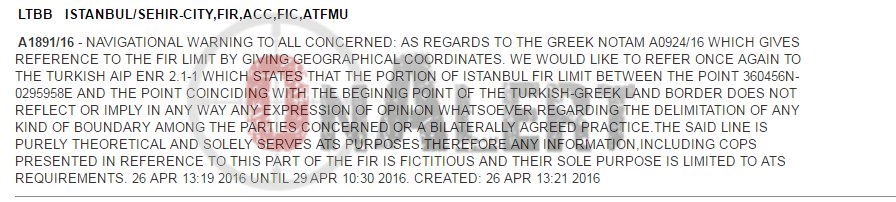 Η Τουρκία απαντάει με δική της ΝΟΤΑΜ, με αριθμό Α1881/16 και ειδοποιεί κάθε διερχόμενο αεροσκάφος από την περιοχή ότι είναι δική της αρμοδιότητα και πως η ελληνική ΝΟΤΑΜ είναι άκυρη.