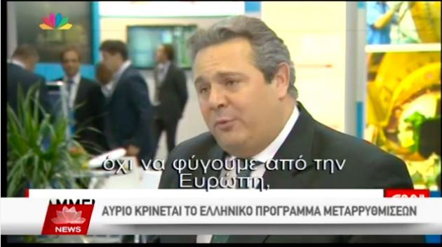Συνέντευξη στο CNN έδωσε ο ΥΕΘΑ Πάνος Καμμένος κατά την διάρκεια της επίσκεψής του στο Άμπου Ντάμπι. Και επεσήμανε για μία ακόμη φορά πως αν η Γερμανία μας οδηγήσει στην χρεοκοπία τότε η Ελλάδα αναγκαστικά θα ανοίξει τους ορίζοντές της -διπλωματικούς και εξοπλιστικούς- προς Ρωσία και Κίνα. Έχει σημασία ότι η συνέντευξη δόθηκε στο περιθώριο της μεγάλης έκθεσης αμυντικού υλικού που γίνεται στο Άμπου Ντάμπι.