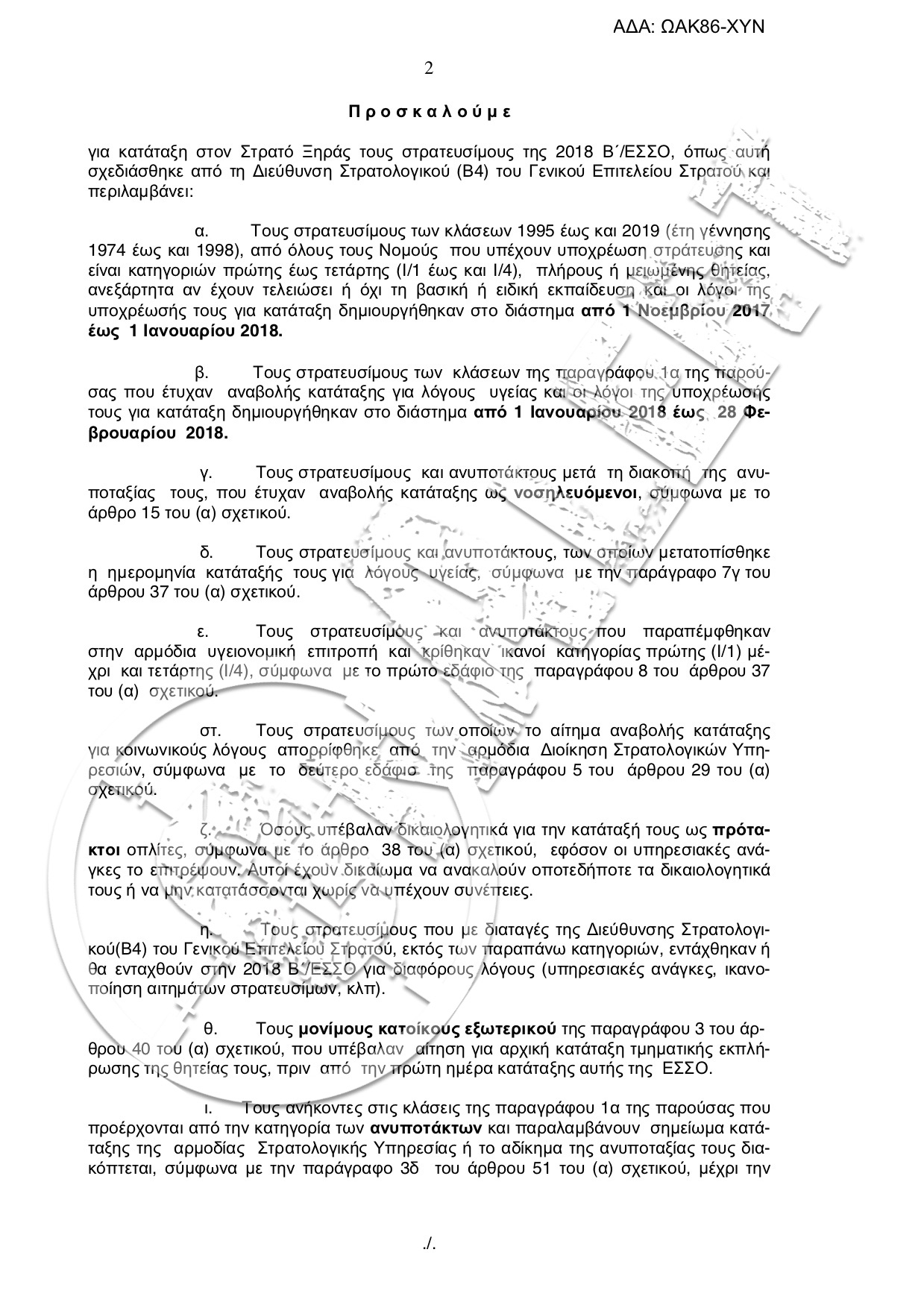 Η εγκύκλιος διαταγή του υπουργού, Αναπληρωτή Εθνικής Άμυνας, κ. Δημήτρη Βίτσα προβλέπει την πρόσκληση για κατάταξη με τη δεύτερη σειρά του 2018: