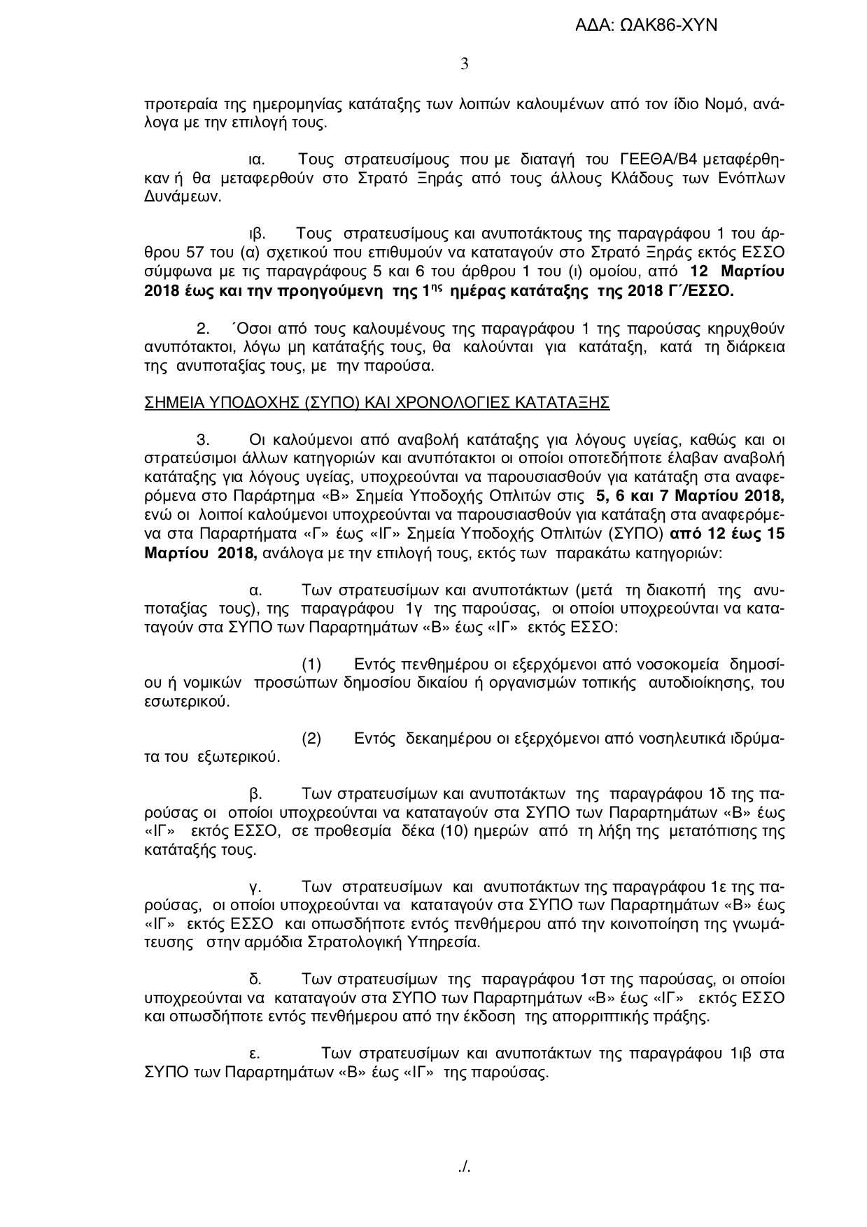 3. Οι καλούμενοι από αναβολή κατάταξης για λόγους υγείας, καθώς και οι στρατεύσιμοι άλλων κατηγοριών και ανυπότακτοι οι οποίοι οποτεδήποτε έλαβαν αναβολή κατάταξης για λόγους υγείας, υποχρεούνται να παρουσιασθούν για κατάταξη στα αναφε- ρόμενα στο Παράρτημα «Β» Σημεία Υποδοχής Οπλιτών στις 5, 6 και 7 Μαρτίου 2018, ενώ οι λοιποί καλούμενοι υποχρεούνται να παρουσιασθούν για κατάταξη στα αναφερόμενα στα Παραρτήματα «Γ» έως «ΙΓ» Σημεία Υποδοχής Οπλιτών (ΣΥΠΟ) από 12 έως 15 Μαρτίου 2018, ανάλογα με την επιλογή τους, εκτός των παρακάτω κατηγοριών: