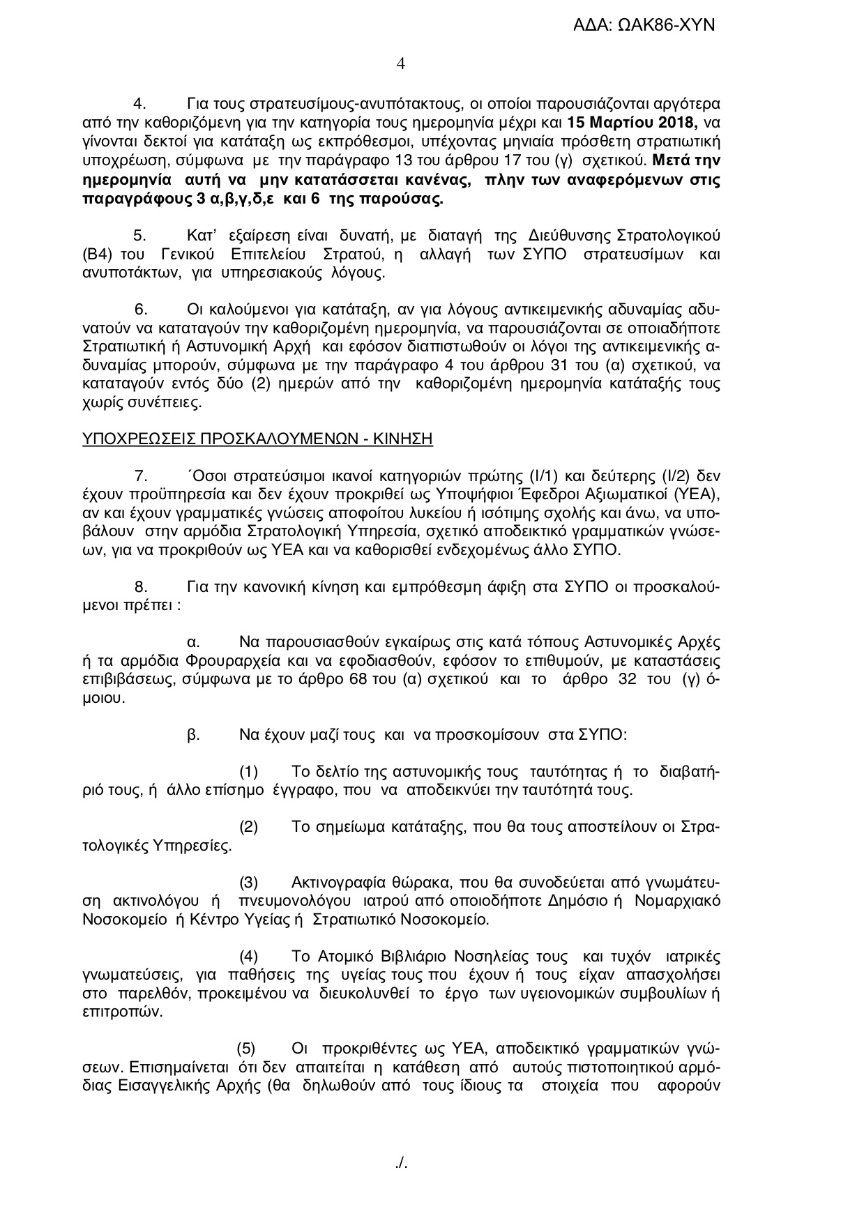 4. Για τους στρατευσίμους-ανυπότακτους, οι οποίοι παρουσιάζονται αργότερα από την καθοριζόμενη για την κατηγορία τους ημερομηνία μέχρι και 15 Mαρτίου 2018, να γίνονται δεκτοί για κατάταξη ως εκπρόθεσμοι, υπέχοντας μηνιαία πρόσθετη στρατιωτική υποχρέωση, σύμφωνα με την παράγραφο 13 του άρθρου 17 του (γ) σχετικού. Μετά την ημερομηνία αυτή να μην κατατάσσεται κανένας, πλην των αναφερόμενων στις παραγράφους 3 α,β,γ,δ,ε και 6 της παρούσας.
