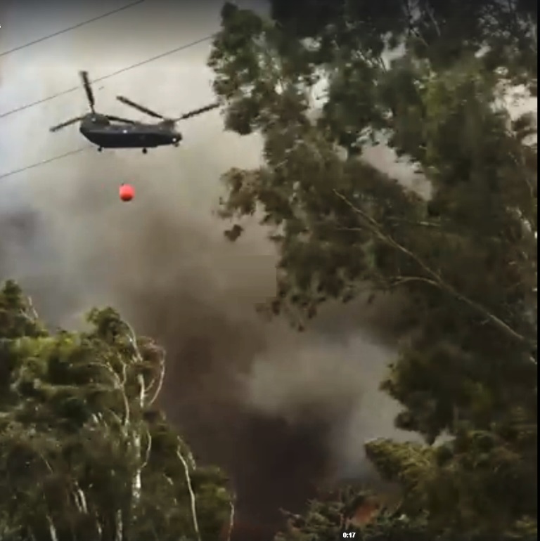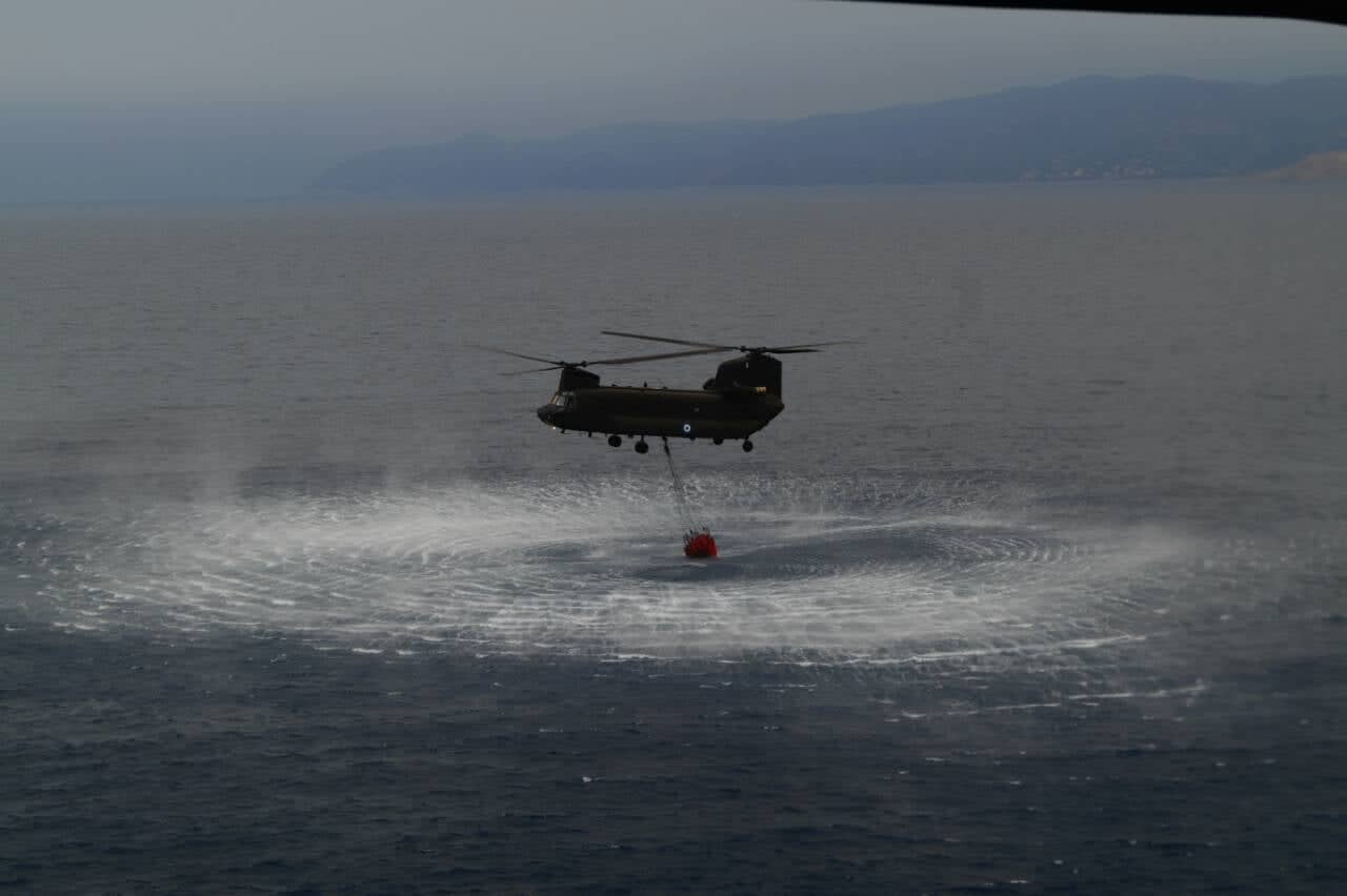 Εντυπωσιακό στιγμιότυπο με Chinook κατά την επαναγέμιση του κουβά που φέρει με νερό