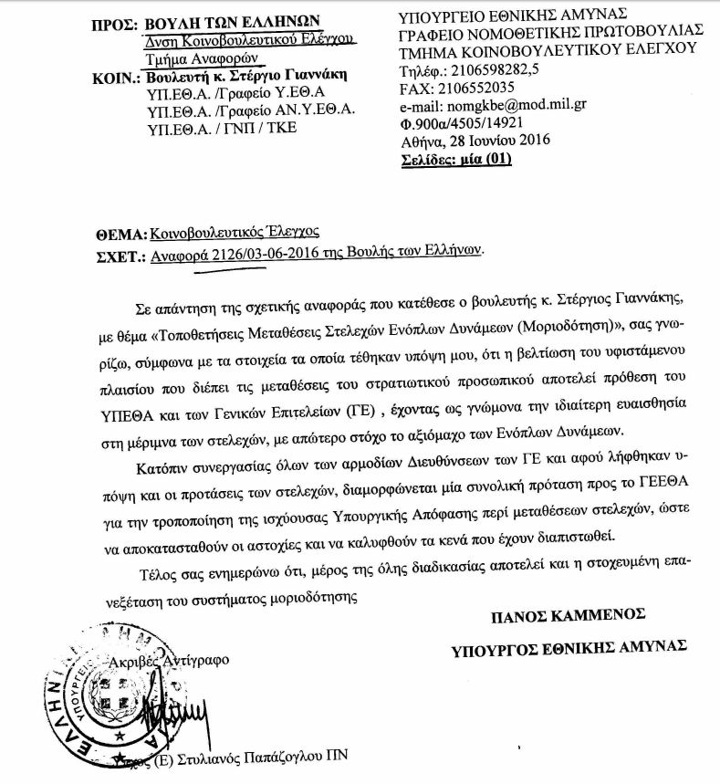 Ο υπουργός Εθνικής Άμυνας Πάνος Καμμένος στην απάντησή του ουσιαστικά παραδέχεται ότι το υφιστάμενο πλαίσιο των μεταθέσεων έχει αδυναμίες και προαναγγέλλει τροποποιήσεις.