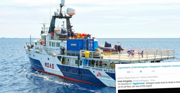 Μέσω twitter και ειδικότερα στο hashtag #agathonisi o βρετανός δημοσιογράφος Patrick Kingsley του Guardian, ο οποίος βρίσκεται πάνω στο σκάφος TOPAZ RESPONDER της ΜΚΟ MOAS έχει αναρτήσει tweet όπου γράφει :