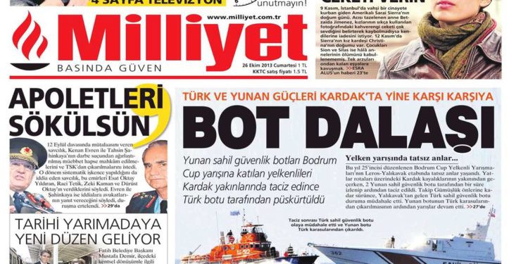 Η τουρκική εφημερίδα Milliyet με πρωτοσέλιδο δημοσίευμα της προσπαθεί να παρουσιάσει πως υπήρξε νέο θέμα «κρίσης των Ιμίων». Σύμφωνα με το δημοσίευμα με τίτλο « μάχη σκαφών» γράφει πως « σκάφη της Ελλάδος και της Τουρκίας ήρθαν αντιμέτωπα και πάλι μπροστά στο Καρντάκ (σ.σ Ίμια)».