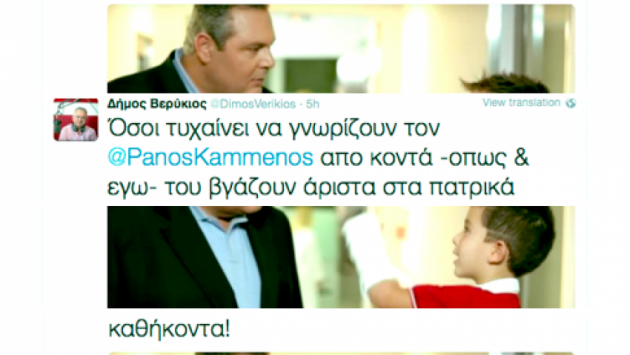 Ο δημοσιογράφος Δήμος Βερύκιος στηρίζει με …1000 τον πρώην ΥΕΘΑ. Ενδεικτικά είναι τα μηνύματά του στο twitter. Όπου με αφορμή το τελευταίο σποτ των ΑΝΕΛ με τον πιτσιρικά Αλέξη να έχει σπάσει το χέρι του, του έδωσε την ευκαιρία να επισημάνει και να αναδείξει την “πατρική” φυσιογνωμία του Πάνου Καμμένου!