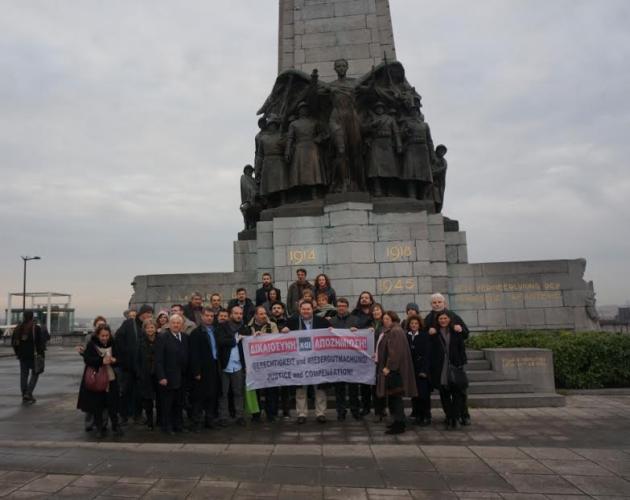 Η αντιπροσωπεία άνοιξε πανό με το σύνθημα »Δικαιοσύνη και Αποζημίωση» σε τρεις γλώσσες – το ίδιο έγινε και στην έδρα του Ευρωκοινοβουλίου, μπροστά σε όλες τις σημαίες, μαζί με τον Μανώλη Γλέζο.