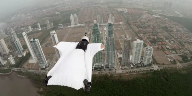 Ιπτάμενη κυρία περνά ανάμεσα από δύο πολυόροφα γραφεία. Οι “ιπτάμενοι άνθρωποι” που βουτάνε στο κενό και κάνουν κανονικές πτήσεις φορώντας τον ειδικό εξοπλισμό όλο και πληθαίνουν. Σπορ για ανθρώπους που έχουν γερά νευρά και δεν διστάζουν να τα δοκιμάζουν σε πολύ ακραίες συνθήκες.