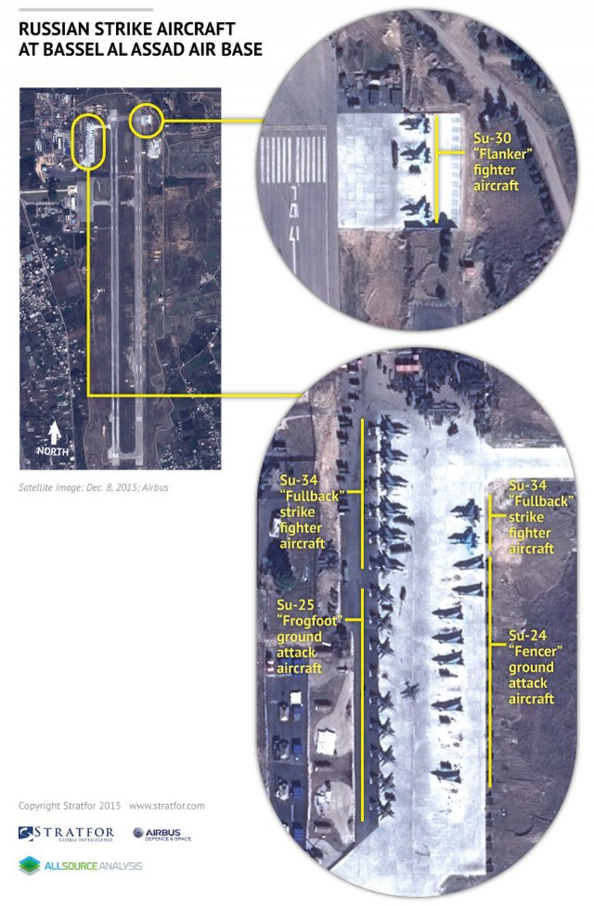 Εκτός απο τα αεροσκάφη Su-25, Su-24, Su-30 και Su-34, που ειχαν αναπτυχθεί αρχικά στην βάση Bassel Al Assad, βλέπουμε περισσότερα Su-34 αεροσκάφη τα οποία πρόσφατα έφτασαν ως ενισχύσεις από τη Ρωσία. Το Su-34 είναι πιο ικανό αεροσκάφος από το Su-24, αυτο που η τουρκική πολεμική αεροπορία πρόσφατα κατέρριψε. Το Su-34, με μια πιο επεκτατική ικανότητα αέρος-αέρος, είναι επομένως σε καλύτερη θέση να αμυνθεί σε σχέση με το Su-24.