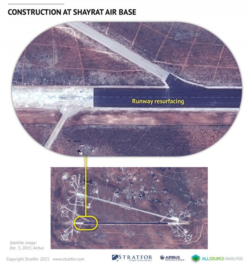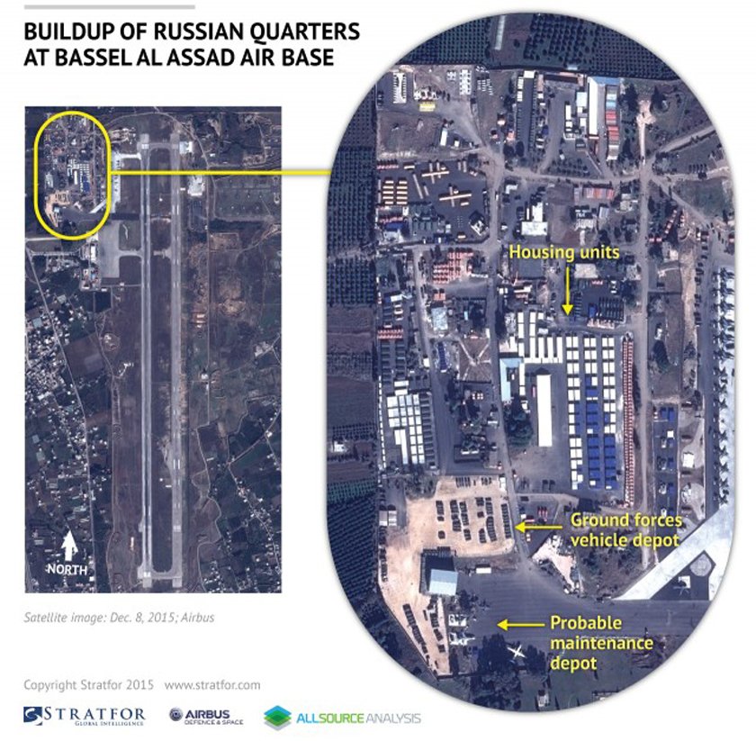 Δορυφορικές εικόνες που εξασφάλισε το αμερικανικό think tank Stratfor μέσω του AllSource Analysis δείχνουν την συνεχή και αυξανόμενη παρουσία των ρωσικών δυνάμεων στην αεροπορική βάση Bassel Al Assad.