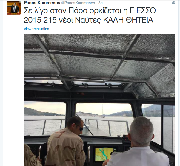 Με το σκάφος “ανορθόδοξου πολέμου” των βατραχανθρώπων της ΔΥΚ πήγε στον Πόρο ο ΥΕΘΑ Πάνος Καμμένος. Κι όπως φαίνεται από τη φωτογραφία που ανέβασε ο ίδιος στο twitter το “τιμόνι” το εμπιστεύθηκε στον Α/ΓΕΝ Βαγγέλη Αποστολάκη που είναι πάντα “βάτραχος”.
