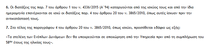 Με την παράγραφο 6 του άρθρου 1 του ανωτέρω ψηφισθέντος νόμου επαναφέρεται πλήρως το συνταξιοδοτικό καθεστώς των Ελλήνων στρατιωτικών όπως αυτό διαμορφώθηκε με το νόμο 3865/2010 και απαλείφθηκε και η διάταξη που αναφερόταν στο 58ο έτος της ηλικίας, που προφανώς από παραδρομή και αβλεψία συμπεριλήφθηκε στο ως κάτωθι σχέδιο του παραπάνω νόμου.