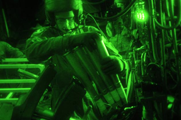 Υπό την κάλυψη του σκότους, ένα AC-130U εξαπολύει την τρομερή δύναμη πυρός του κατά θέσεων τζιχαντιστών.