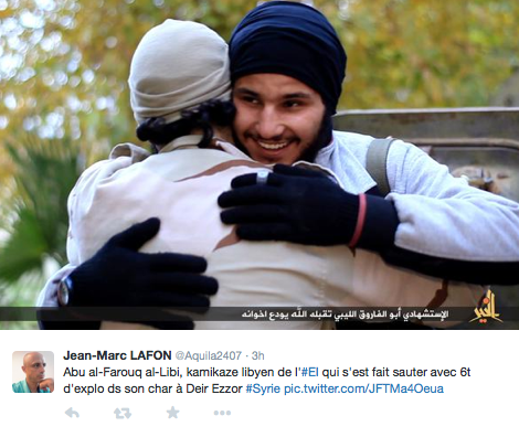Οι φωτογραφίες του Αμπού αλ-Φαρούκ αλ-Λίμπι κάνουν τον γύρω του διαδικτύου τις τελευταίες ώρες αφου αναρτήθηκαν σε διαφορους λογαριασμούς στο Twitter. Οι φωτογραφίες του τζιχαντιστή κάνουν ιδιαίτερη εντύπωση καθως λίγο πριν την αυτοκτονία του στο όνομα της τζιχάντ ο άνδρας χαμογελάει, θα μπορούσε κανείς να πει οτι ο τζιχαντιστής που ετοιμάζεται να σκορπίσει τον τρόμο και ταυτόχρονα να πάρει την ιδια την ζωή του, λάμπει απο χαρά. Ενα στοιχείο που επικρατεί βαθυά στους οπαδούς του λεγόμενου Ισλαμικού Κράτους και κάτι που δε μπορει να αγνοήσει η Δύση