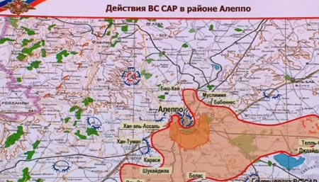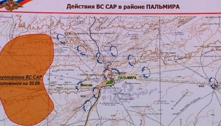 Ένας χάρτης στον οποίο απεικονίζονται οι ρωσικές στρατιωτικές επιχειρήσεις στη Συρία, πλάνα με τον οποίο συμπεριλήφθηκαν σε ρεπορτάζ της ρωσικής δημόσιας τηλεόρασης, αφήνει να εννοηθεί ότι μονάδα του ρωσικού πυροβολικού δρα στην επαρχία Χομς της Συρίας, παρά το γεγονός ότι ο πρόεδρος Βλαντίμιρ Πούτιν έχει διαψεύσει επανειλημμένα την παρουσία ρωσικών χερσαίων δυνάμεων στο συριακό έδαφος.