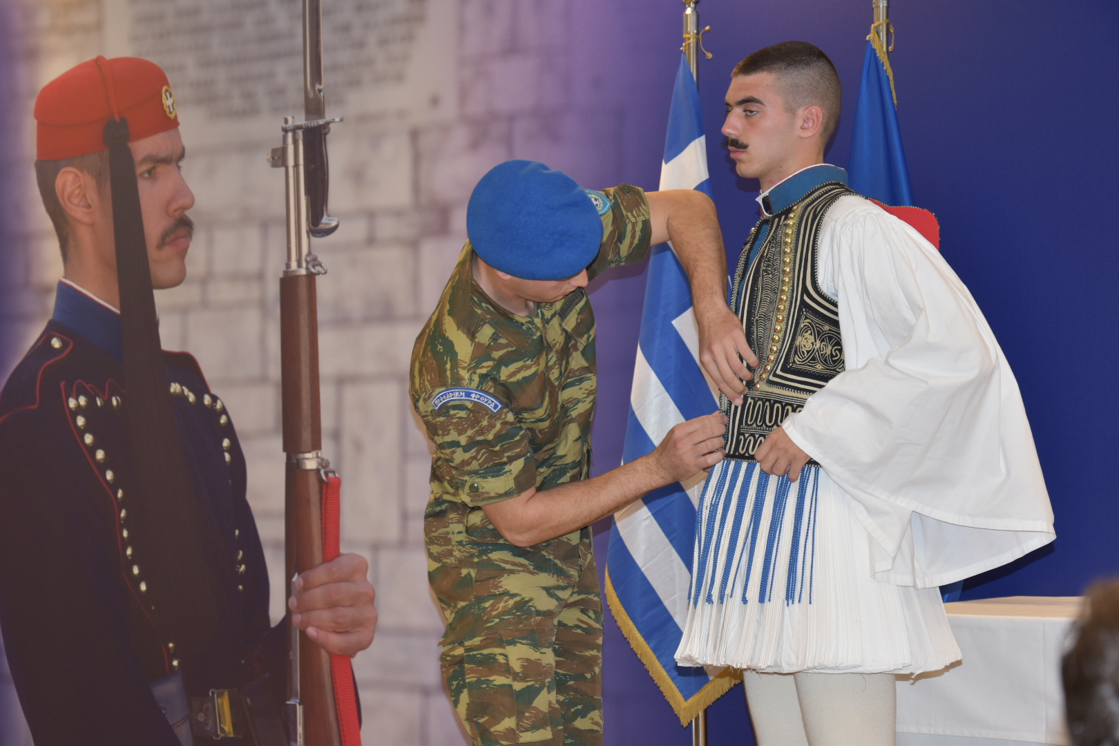 Οι πρώτοι 60 περίπου τυχεροί που είχαν δηλώσει συμμετοχή, ενημερώθηκαν για την στολή του Έυζωνα και στη συνέχεια παρακολούθησαν μπροστά στα μάτια τους ένα «ζευγάρι» ευζώνων να ντύνεται τη στολή και να εξηγεί βήμα-βήμα την τελετουργία.