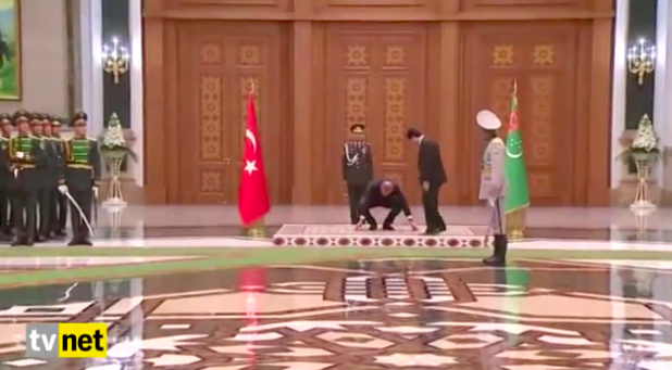 Ο Ερντογάν στο Τουρκμενιστάν. Δίπλα στον ομόλογό του μετά από τους εθνικούς ύμνους των δύο χωρών, αιφνιδιάζει τους πάντες καθώς σκύβει για να πάρει κάτι από το πάτωμα! Είναι το μικρό σημαιάκι της Τουρκίας που καθόριζε που θα στεκόταν ο Τούρκος πρόεδρος. Δεν αφήνει τίποτα να πέσει κάτω ο Ταγίπ και ειδικά την τουρκική σημαία. Και στην επικοιωνία είναι μπροστά ο Ερντογάν. Αλλού τα ΄χει χάσει.