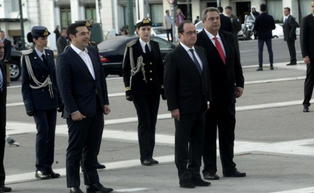 Ο τηλεοπτικός φακός της κρατικής τηλεόρασης “έπιασε” την στιγμιαία “τρομάρα” του Γάλλου Προέδρου Φρανσουά Ολάντ όταν ξαφνικά το άγημα άρχισε όχι να ψάλλει αλλά να …ουρλιάζει τον Εθνικό μας Ύμνο. Απομεινάρι της εποχής Κωσταράκου η διαταγή έχει μείνει σε ισχύ με αποτέλεσμα να παρουσιάζεται ένα θέαμα που όπως μας επεσήμαναν δεκάδες στρατιωτικοί τους προσβάλλει.