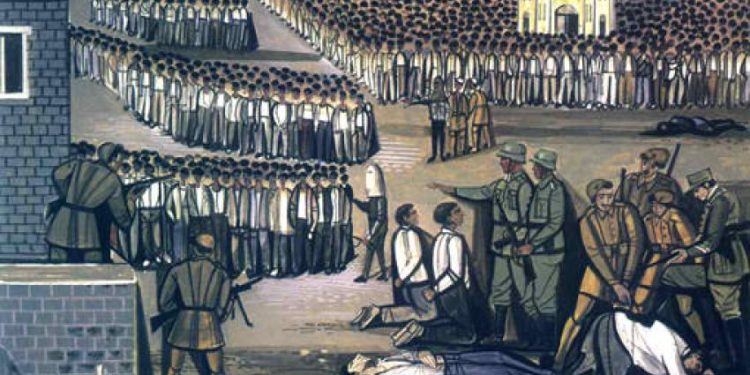 Μετά τις 6:00΄ ακούγονται τα χωνιά των ταγματασφαλιτών: «Προσοχή-προσοχή! Σας μιλάνε τα τάγματα ασφαλείας. Όλοι οι άντρες από 14 έως 60 ετών να πάνε στην πλατεία της Οσίας Ξένης για έλεγχο ταυτοτήτων. Όσοι πιαστούν στα σπίτια τους θα τουφεκίζονται επί τόπου». Πανικός κυριαρχεί παντού. Οι πόρτες των παραγκόσπιτων γκρεμίζονται και όλος ο ανδρικός πληθυσμός σέρνεται στον τόπο του μαρτυρίου.