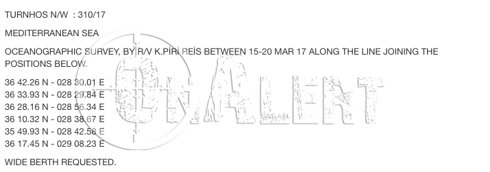 Φαίνεται οτι οι «έρευνες» της Τουρκίας στο Αιγαίο παρατείνονται, καθώς με τη NAVTEX 310/17 η Τουρκία ανήγγειλε ότι το ωκεανογραφικό Πιρι Ρέις θα πραγματοποιήσει έρευνες από 15-20 Μαρτίου σε περιοχές που εκτός των σημείων Ανατολικά της Ρόδου, τα οποία περιλαμβάνουν και σημεία οριακά εντός των τουρκικών χωρικών υδάτων στην περιοχή της Μαρμαρίδας. Η πρώτη NAVTEX για το ερευνητικό σκάφος ανέφερε οτι θα ηταν στην περιοχή απο τις 8 Μαρτίου, Τετάρτη μέχρι και τις 18 Μαρτίου.