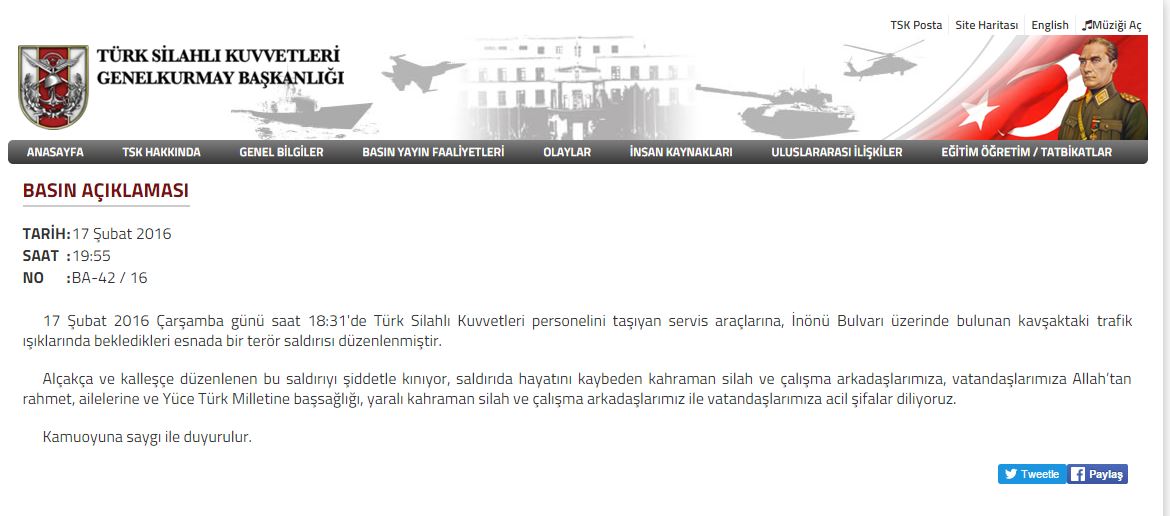 Το τουρκικό Γενικό Επιτελείο σε ανακοίνωσή του σημειώνει ότι η επίθεση έγινε στις 18:31 στη λεωφόρο Ινονού και κάνει λόγο για τρομοκρατική επίθεση.