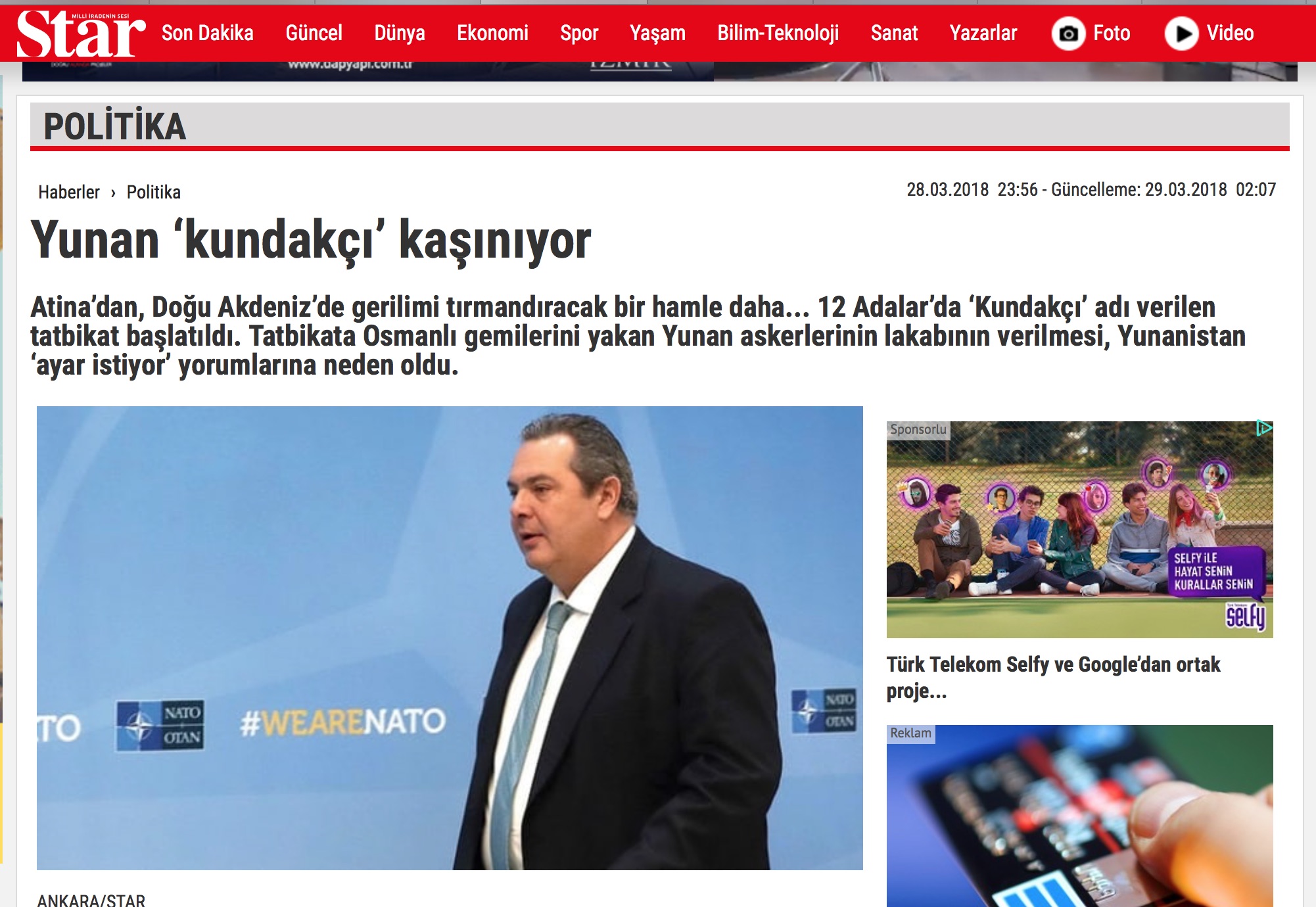 Όπως αναφέρεται στο δημοσίευμα: «Άλλη μια κίνηση από την Αθήνα για την αύξηση των εντάσεων στην Ανατολική Μεσόγειο. Σε 12 νησιά ξεκίνησε μια άσκηση που ονομάζεται «Πυρπολητής. Η εφαρμογή του ψευδώνυμου των Ελλήνων στρατιωτών που έκαψαν τα οθωμανικά πλοία τροφοδότησε σχόλια η Ελλάδα θέλει «ένα σκηνικό» έντασης» αναφέρει η Star