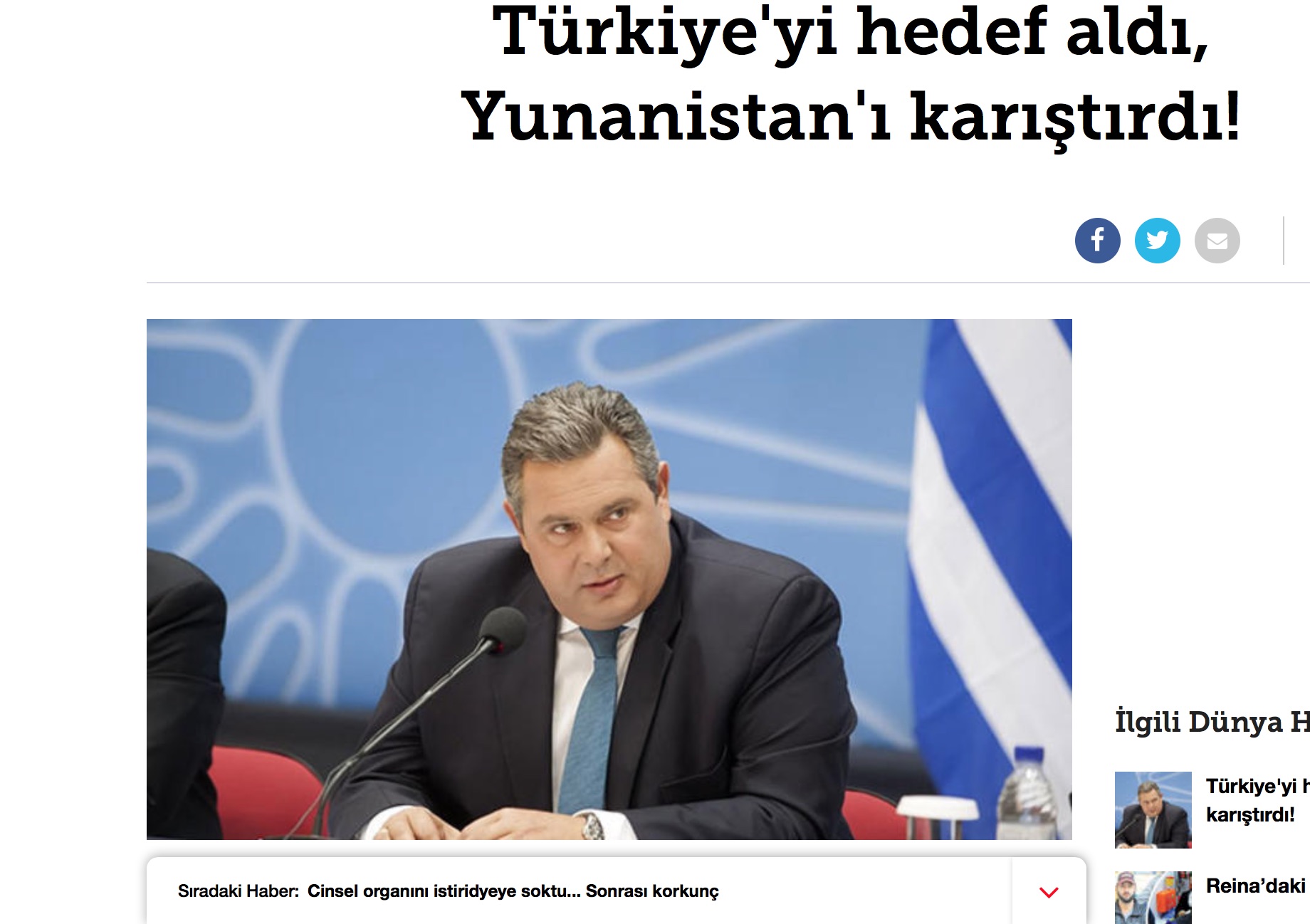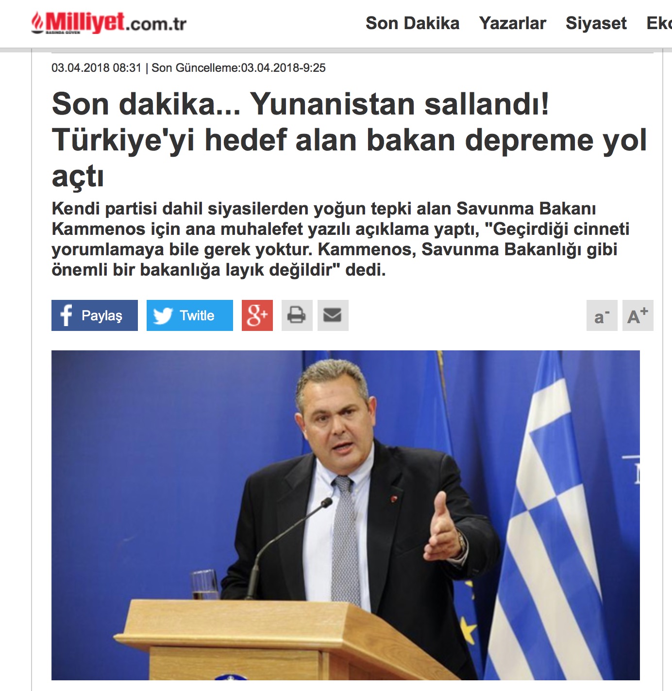 Η Τουρκία ήταν ο στόχος η Ελλάδα κλονίστηκε γράφει στον τίτλο της η ηλεκτρονική έκδοση της εφημερίδας Μιλιέτ. Στο δημοσίευμά της αναφέρεται στις πολιτικές αντιδράσεις που προκάλεσαν οι χθεσινές δηλώσεις του υπουργού Εθνικής Άμυνας κ. Πάνου Καμμένου. Με ανοίκειο τρόπο χαρακτηρίζει τον ΥΕΘΑ επικεφαλής του εθνικιστικού κόμματος ΑΝΕΛ.