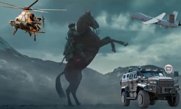 Οι έφιπποι καβαλάρηδες γίνονται άρματα μάχης ALTAY, τα βέλη που σκίζουν τους αιθέρες σε πυραύλους και drones Bayraktar, τα ανιχνευτικά γεράκια σε ελικόπτερα ΑΤΑΚ και οι ναύτες που τραβούν κουπί σε υπερσύγχρονες φρεγάτες και άλλα πολεμικά πλοία.