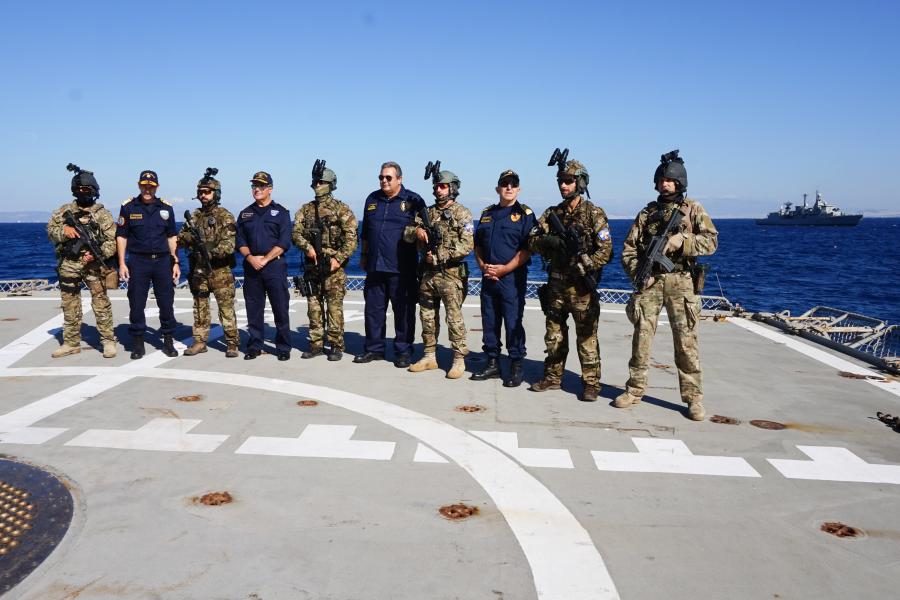 Αναλαμβάνουμε, λοιπόν, την ευθύνη μιας περιοχής, ιδιαίτερα αυτής που είναι μεταξύ της Κρήτης, του Σουέζ, της Κύπρου και της Μάλτας, όπου γίνεται η μεγαλύτερη διακίνηση παράνομων όπλων, πετρελαίου, ναρκωτικών, που χρηματοδοτεί την τρομοκρατία. Άρα αναλαμβάνουμε έναν τομέα ευθύνης που θα πρέπει να μας βάλει μπροστά, ως μια χώρα ενήμερη στην αντιμετώπιση της τρομοκρατικής απειλής. Η δική σας εκπαίδευση, τους τελευταίους μήνες, σε θάλασσα και στεριά, θα οδηγήσει τις επόμενες εκπαιδεύσεις.
