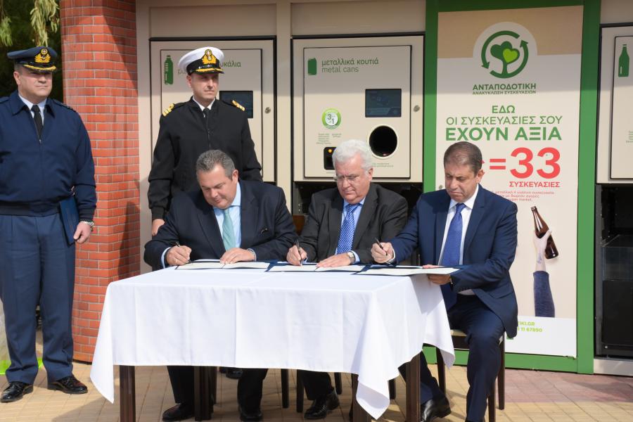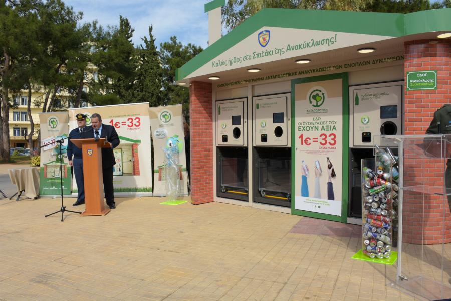 «Είμαι στην ευχάριστη θέση, ως Υπουργός Εθνικής Άμυνας, να βρίσκομαι εδώ μαζί σας, σε αυτή την συμβολική τελετή, για την πιλοτική εφαρμογή ενός από τα ολοκληρωμένα προγράμματα ανταποδοτικής ανακύκλωσης που υπάρχουν διαθέσιμα στην Ελλάδα.